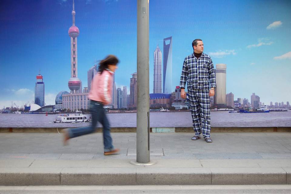 Das bühnenartige Settting verweist auf zwei Phänomene, die überall in Chinesischen Städten wahrgenommen werden können: