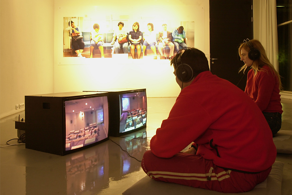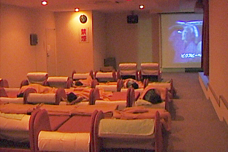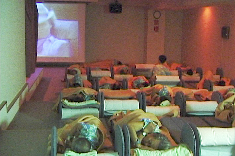 Zwei Monitore zeigen die beiden Hälften eines Liegeraumes in einem japanischen Freizeitzentrum. Der Liegeraum ist durch eine Wand in einen Teil für Frauen und einen Teil für Männer geteilt. Die Leinwand, auf der ein amerikanischer Film mit japanischen Untertiteln gezeigt wird, verbindet die beiden Räume. Er kann gleichzeitig von den Frauen als auch von den Männern gesehen werden. Trotz des Filmangebots wird der Raum jedoch auf beiden Seiten als Schlafraum benutzt.