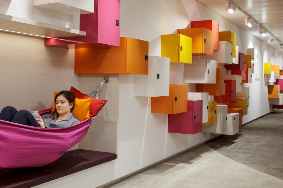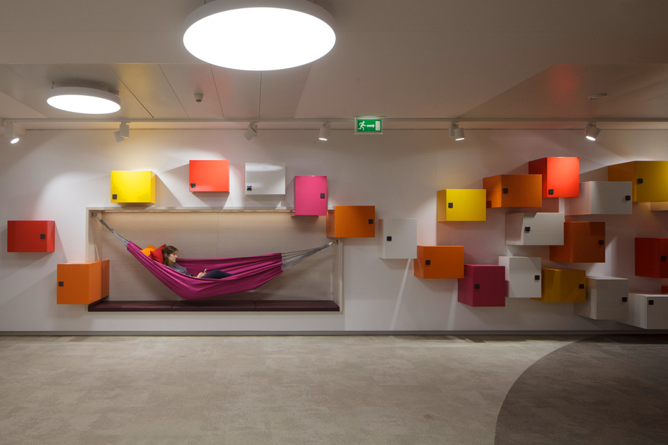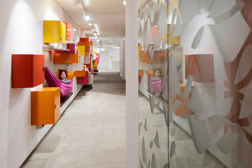 Eine Wand, bestehend aus einer Vielzahl frei angeordneter Schliessfächer, bildet das repräsentative Entrée im 4. Geschoß des Wiener Börsegebäudes. Mitten in diesem „bewegten Pixelraum“ sind Nischen als Ruhezonen integriert. Eine Hängematte bietet Raum für Entspannung und Regeneration.