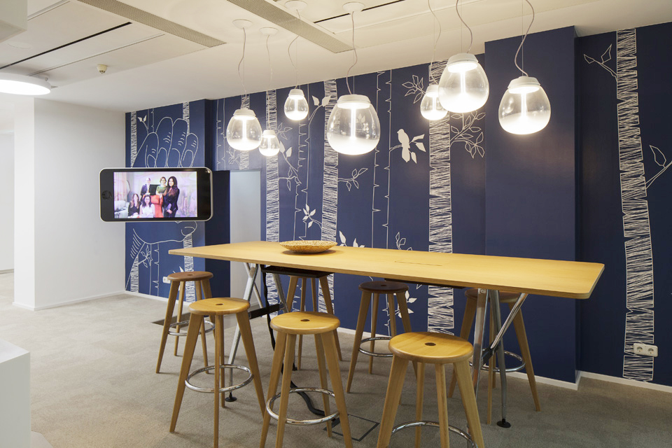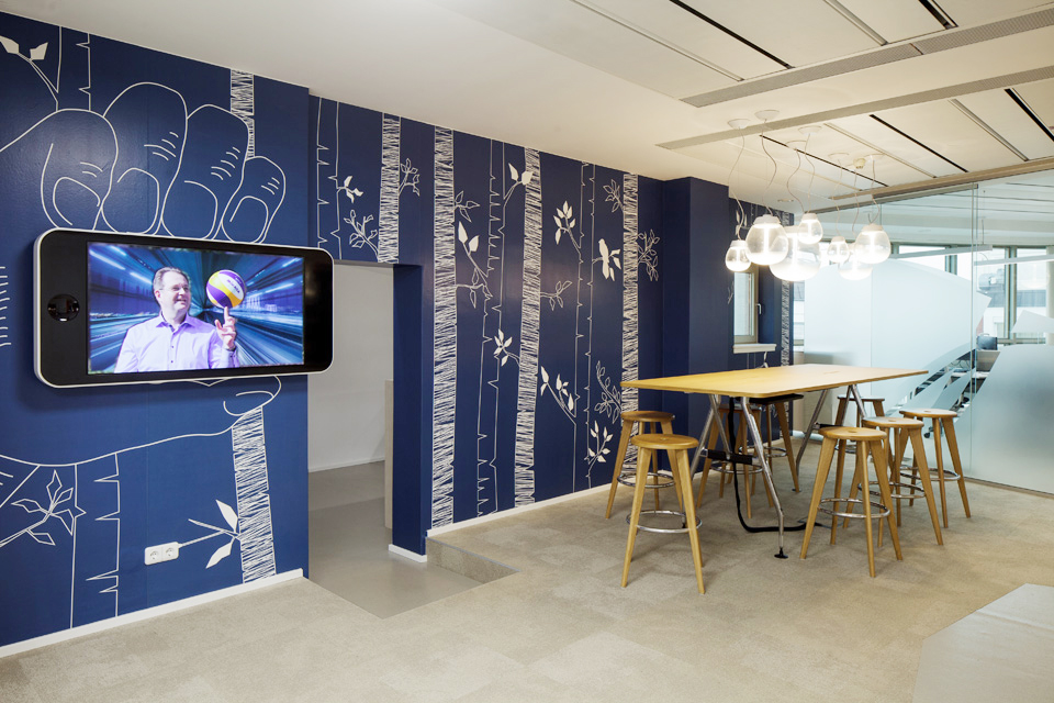 Ein großer Monitor, der in Form eines Smartphones in das Bildmotiv der Tapete eingearbeitet ist, bietet den Mitarbeiterinnen und Mitarbeitern die Möglichkeit, eigene Bildbotschaften und Filmsequenzen zu zeigen. Die Teeküche wird neben ihrer Funktion als Ort persönlicher Begegnung zur Plattform für Aneignung – zur Bühne für Eigenproduktion und Selbstdarstellung.