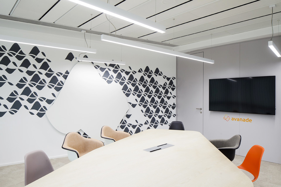 Die Corporate Identity von avanade und das Leitsystem zeichnen sich dagegen zurückhaltend an den Wänden der Erschließungs- und Besprechungsräume ab: Filzwände mit großzügigen wellenförmigen Intarsierungen säumen die im Grundriss ringförmig angelegten Gangbereiche. In einer Verwebung von Logofragmenten formieren sich flüchtige Muster ähnlich vorbeiziehender Vogelschwärme.