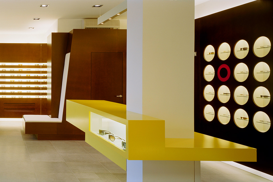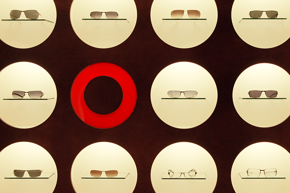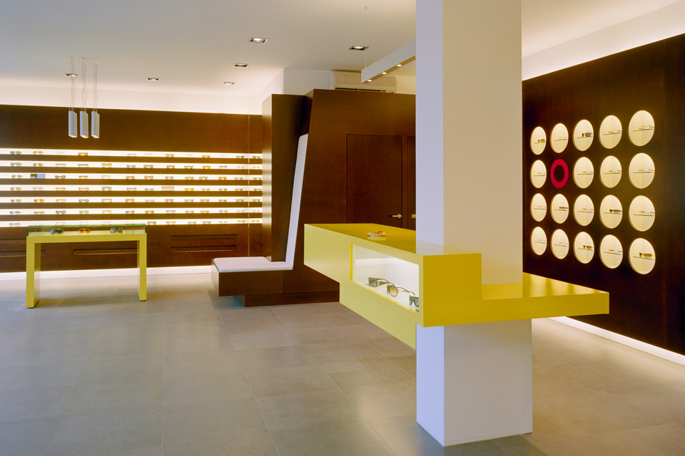 An den beiden Seiten des Portals schliessen im Inneren des Shop die Brillendisplays für die Produktpräsentation an. Diese verlaufen in einer Wandabwicklung mit horizontal gegliederten und zum Teil hinterleuchteten Streifen, die durch zwei Spiegelflächen optisch verlängert sind. Im Band sind auch ein Vitrine zur Ausstellung spezieller Produkte sowie eine Logowand mit punktuellen, hinterleuchteten Ausstellungsflächen integriert.