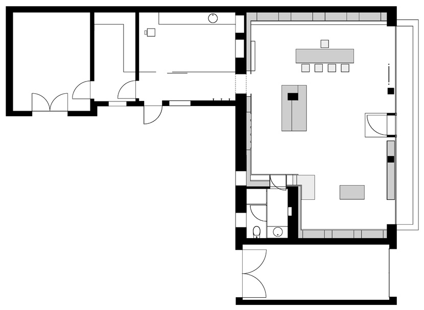 Mehrere horizontal ausgerichtete, farblich akzentuierte, und zum Teil schwebende Möbelobjekte unterbrechen die Statik des durch Stahlbetonsäulen gegliederten Geschäftsraumes und unterstützen eine fliessende Anordung, die zur Maximierung der optischen Verbindung von Innen und Aussen beiträgt.