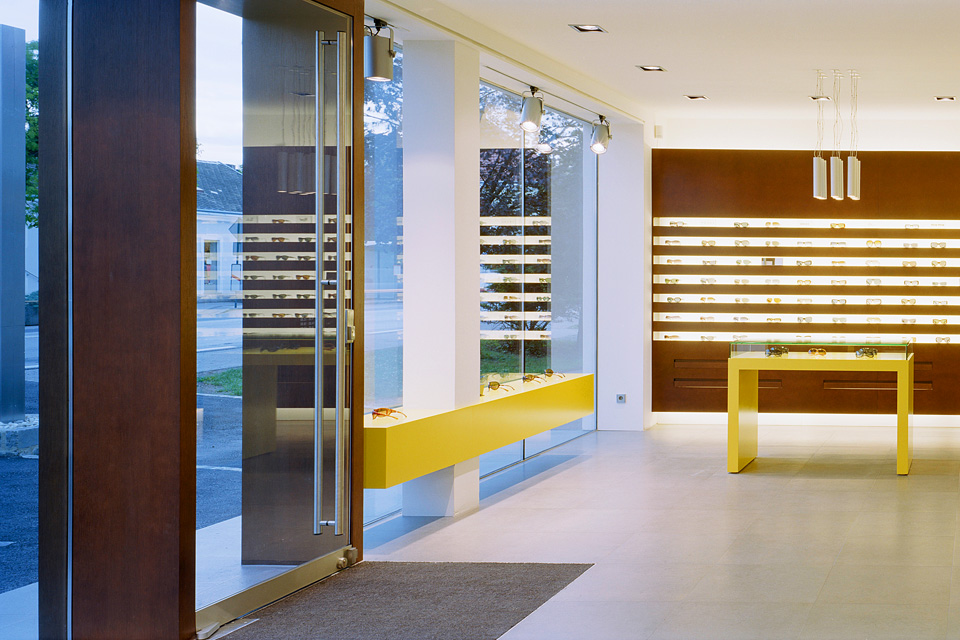 Ein bestehendes Wohnhaus an der Landstrasse in Sollenau, südlich von Wien, wird zum Brillenfachgeschäft umgebaut. Die direkte Nachbarschaft mehrerer, bereits etablierter Modegeschäfte, die Kunden aus dem Wiener Einzugsbereich attrahieren, bildet das synergetische Umfeld des Verkaufsstandortes.