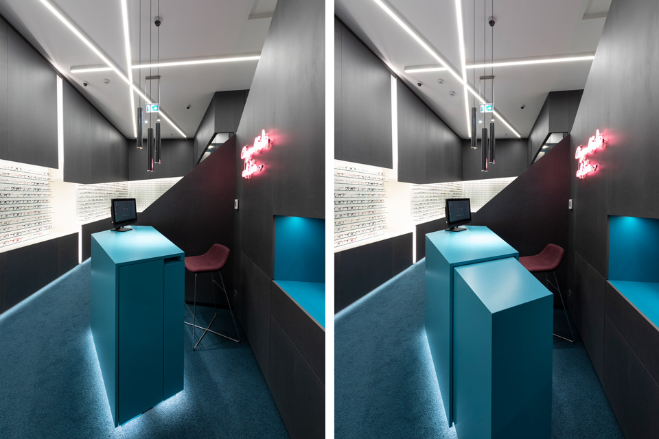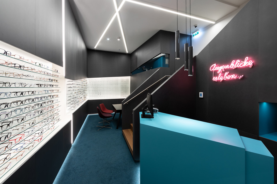 Hinterleuchtete horizontale Schlitze brechen das Monolithische der Wandeinbauten auf und geben die Ware der Brillen frei. Im Bereich des zentralen, felsenförmigen Verkaufspultes gibt ein Spalt in der Seitenwand den Durchblick zum benachbarten Foyerzugang des Hotels frei.